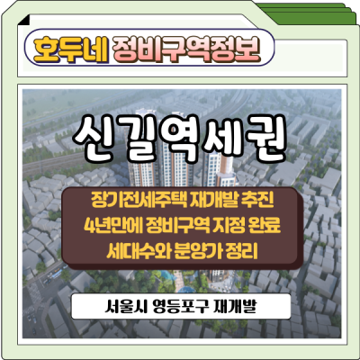 건축 개요 ● 위치 : 영등포구 신길동 96-24번지 일원 ● 면적 : 13,497㎡ (약 4,082.84평) ● 용도지역 : 제2종(7층) 일반주거지역·준주거지역 ● 건폐율·용적률 : 60% 이하 / 460% ● 건축개요 : 지하 3층 ~ 지상 최고 40층 / 총 3개동 ● 총세대수 : 453세대 (분양 296, 임대 157) ● 토지등소유자수 : 약 1...