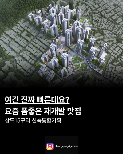 여긴 진짜 빠른데요? 요즘 폼좋은 재개발 맛집 1️⃣ 상도동은 상전벽해 중 최근 서울 재개발 구역 중에서 가장 주목받는 곳을 꼽으라면 단연 상도15구역입니다. 2022년 말 후보지로 선정된 지 불과 3년도 안 되어 시공사를 뽑는 단계까지 왔다는 건 정말 보기 드문 사례인데요. 지지부진하던 예전 재개발과는 차원이 다른 '신속통합기획'의 힘을 보여주며, 상도동...
