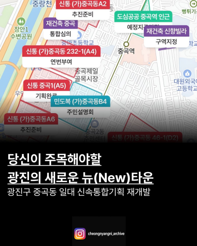 당신이 주목해야할 광진의 새로운 뉴(new)타운 광진구 중곡동 일대 신속통합기획 1️⃣ 광진의 숨은 보석, 중곡동이 깨어나고 있습니다 광진구 하면 보통 구의동이나 광장동의 한강변 아파트 단지들을 먼저 떠올리곤 합니다. 그동안 중곡동은 광진구 내에서도 상대적으로 저층 노후 주택이 밀집해 있어 주목을 덜 받았던 것이 사실인데요. 하지만 최근 중곡동 일대가 신속...