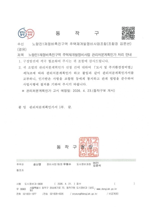 서울 동작구 노량진1재정비촉진구역(이하 노량진1구역) 재개발 조합이 관리처분계획인가를 획득하며 사실상 막바지 단계에 진입했다. 2006년 재정비촉진지구 지정 이후 약 20년 만의 성과다. 21일 정비업계에 따르면 동작구는 이날 노량진1구역 재개발 사업에 대한 관리처분계획인가를 결정했다. 이번 인가로 노량진재정비촉진지구 내 8개 구역이 모두 관리처분계획인가...