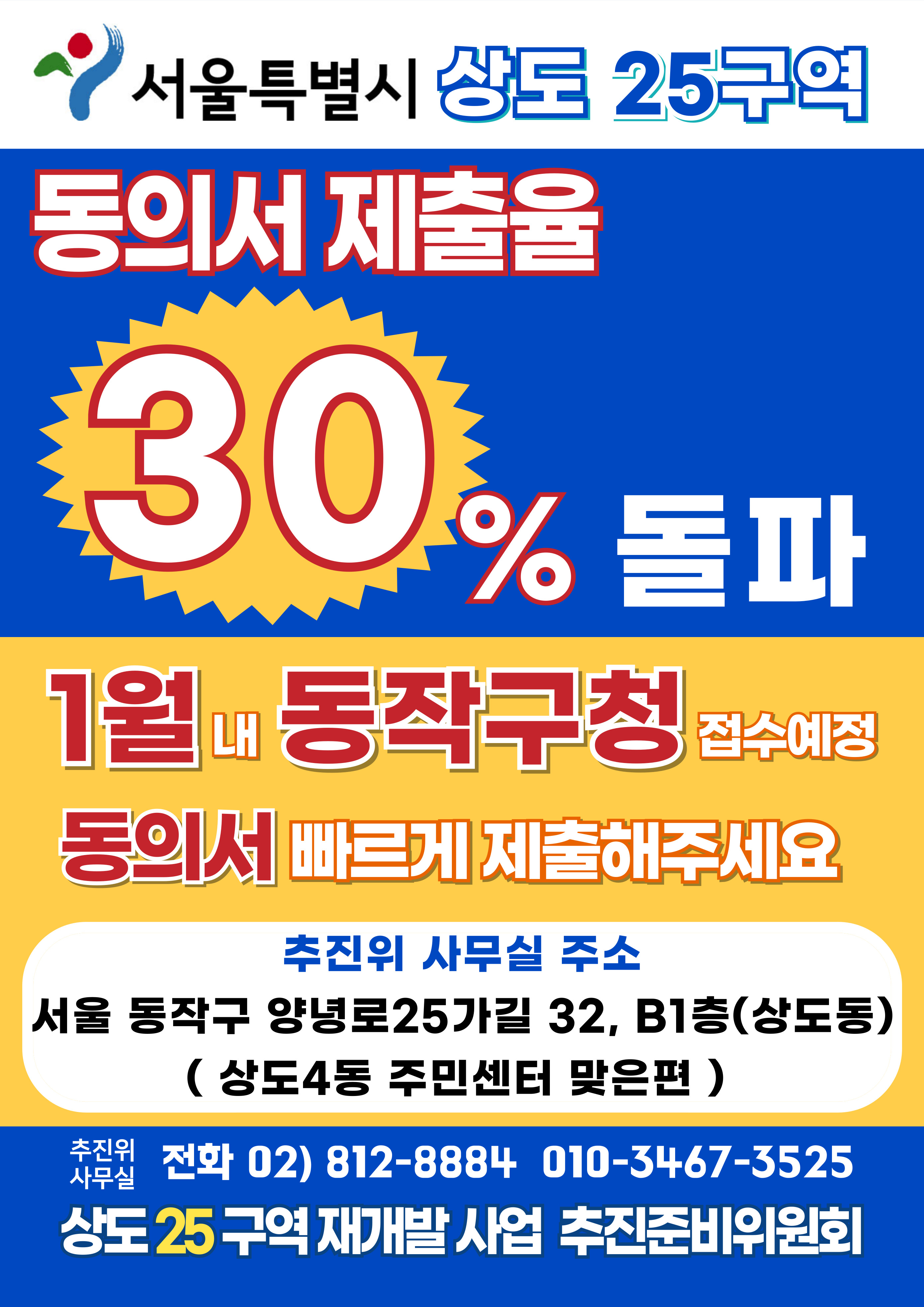 1/2 추진 위원회 사무실 오픈 1/5 OS 요원 투입 하여 동의서 징구 시작 1/11 동의율 30% 달성 1/15 동의율 40% 달성 상도 25구역 속도 장난 아닙니다 상도 25구역 주민들 힘차게 나아 갑시다