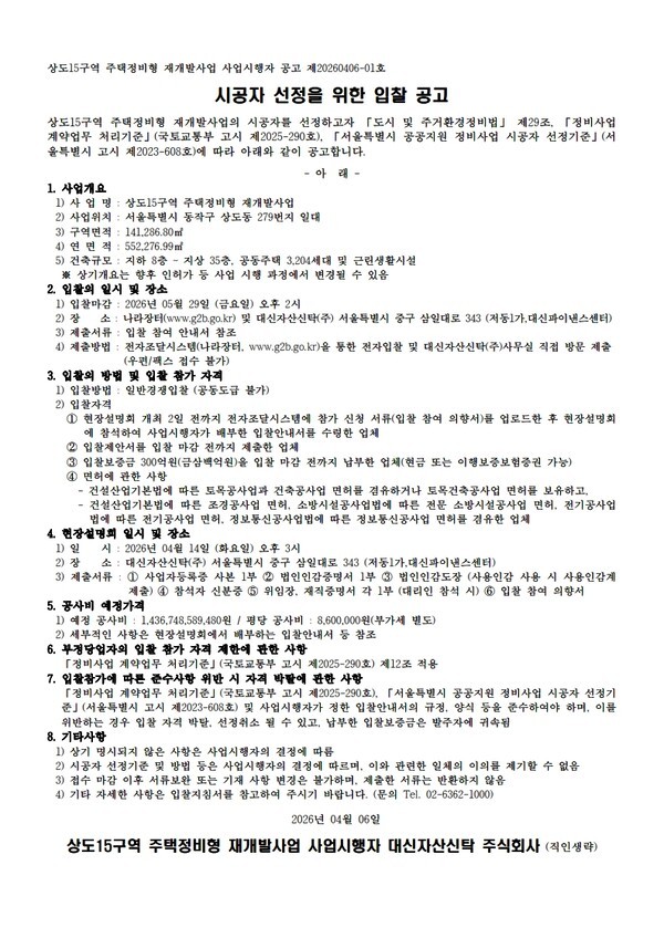 서울 동작구 상도15구역 재개발사업이 시공사 선정을 위한 입찰 공고를 내고 시공사 선정 절차에 착수했다. 6일 정비업계에 따르면 상도15구역 주택정비형 재개발사업 시행자인 대신자산신탁은 이날 시공사 선정을 위한 입찰 공고를 발표했다. 사업은 서울 동작구 상도동 279번지 일대에서 추진되며, 구역면적 14만1286.80㎡, 연면적 55만2276.99㎡ 규모...