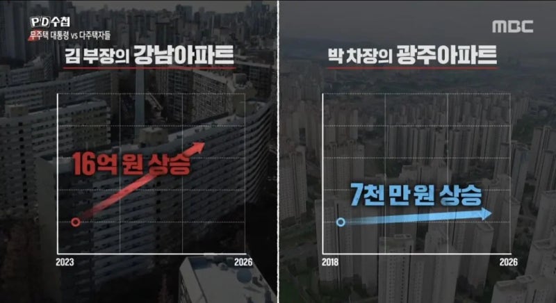 * 이 글은 2026년 3월 10일 22시 20분 방영된 MBC PD수첩 '무주택 대통령 VS 다주택자'를 참조로 작성하였습니다. 서론 : 어디에 사는지에 따라 자산격차가 커지고 있다. a. 97학번(78년생)동기 김부장과 박차장 97학번 동기 김부장과 박차장 1997년 전남대학교 전자공학과에 입학한 김부장과 박차장은 1978년생(현재 48세)이다. 같은 ...