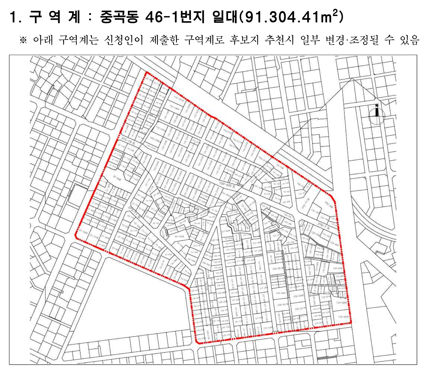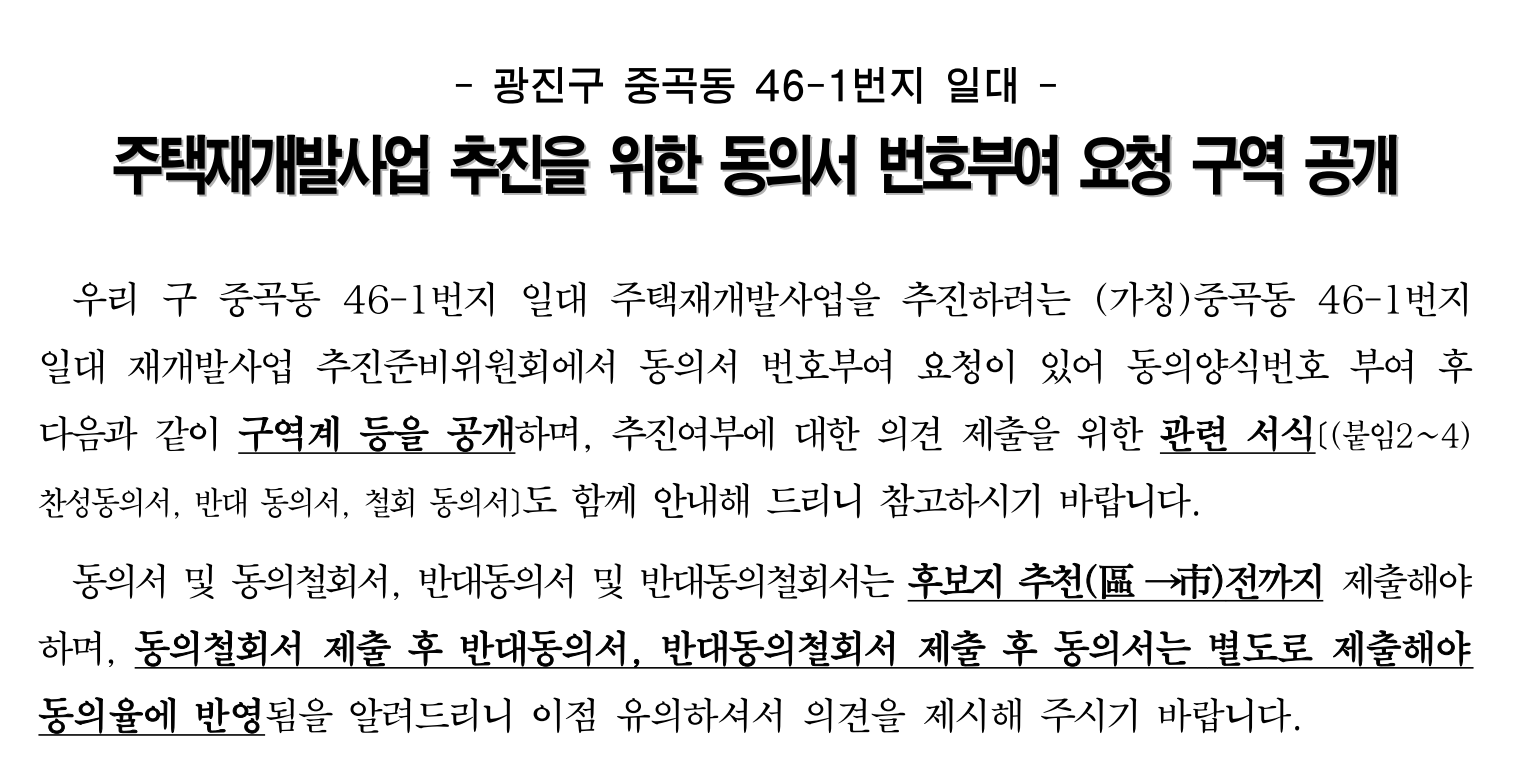 광진구 중곡동 46-1번지 일대 주택재개발사업 주택재개발사업 추진을 위한 동의서 번호부여 요청 구역 공개