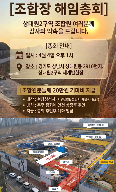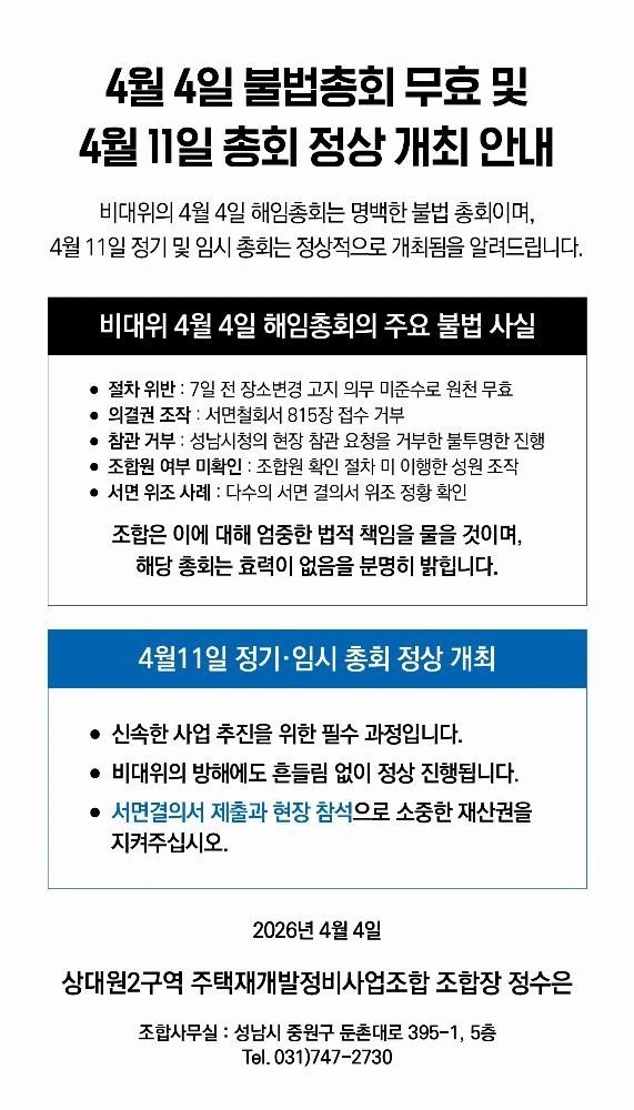 안녕하세요. 신흥1구역 재개발사업 주민대표회의입니다. 금번 감정평가 및 권리자 분양과 관련하여, 그간 주민대표회의가 추진해 온 주요 성과와 함께 아래와 같이 안내드립니다. 1. 감정평가 통지 일정 감정평가 통지서는 2026년 4월 넷째주 경 개별 발송될 예정입니다. 이는 개별 통지에 따른 책자 제작, 인쇄 및 검수 등 행정 절차에 따른 불가피한 소요 기간, 권리자분양가 등의 변동이 반영된 것입니다. ※ 첨부 예정: 감정평가 통지서, 권리자 분양 안내문 2. 권리자 분양 안내 책자 주요 내용 분양신청 공고문 및 절차 안내 사업시행인가 기준 분양대상 자산 내역 아파트 및 상가 분양가격 추산액 배치도 및 단위세대 평면도 등 3. 감정평가 결과 개요 금번 감정평가 결과는 면적당 기준 약 4.82% 상승으로, 동기간 지가 상승률(약 3.12%)을 상회하는 수준으로 확인되었습니다. 4. 고도제한 완화 및 설계변경 추진 (핵심 업적) 주민대표회의는 단순한 사업 진행에 그치지 않고, 사업성 극대화를 위한 제도 변화 대응에 선제적으로 나서 왔습니다. 그 결과, 최근 개정된 「군사기지 및 군사시설 보호법 시행령」에 따른 고도제한 완화 흐름을 즉시 반영하여 우리 구역 설계에 적용을 추진 중이며, 이를 통해 기존에는 불가능했던 층수 완화가 현실적으로 가능해지는 단계에 진입하였습니다. 이는 외부 환경 변화에 수동적으로 대응한 것이 아니라, 주민대표회의가 방향을 선도하여 만들어낸 실질적인 성과입니다. 5. 용적률 인센티브 확보 (직접적 성과) 또한 주민대표회의는 재개발 연합회와의 긴밀한 협력 및 지속적인 의견 개진을 통해 성남시 용적률 인센티브 제도 개선 과정에 적극적으로 참여해 왔으며, 그 결과 층간소음 저감 설계 녹지 확보 확대 주차장 기준 완화 등을 통한 추가 용적률 확보가 가능한 구조를 현실화하였습니다. 이는 단순한 정책 변화가 아니라, 실제 사업성에 직결되는 핵심적인 성과입니다. 6. 사업성 대폭 개선 예상 (결과) 상기와 같은 층수 완화 + 용적률 증가가 동시에 반영될 경우, 일반분양 물량 증가로 이어지며 수천억 원 규모의 추가 수익 창출이 예상됩니다. 이는 일반적인 사업 추진 과정에서는 확보하기 어려운 수준의 성과로, 현재 신흥1구역이 확보한 경쟁력의 핵심입니다. 7. 왜곡 및 폄하에 대한 입장 그럼에도 불구하고 일부에서는 이와 같은 성과를 의도적으로 축소하거나, 초기 감정평가 결과만을 근거로 “사업이 어렵다”는 등의 왜곡된 정보를 유포하며 토지등소유자의 불안을 조장하는 사례가 발생하고 있습니다. 이는 사업의 전체 구조와 향후 변화를 전혀 반영하지 않은 주장으로, 주민 여러분께서는 이에 현혹되지 않으시길 당부드립니다. 특히, 타 구역 사례와 같이 권리자 분양가는 충분히 조정 가능성이 있으며, 현재 인근 입주권 실거래가 또한 전용 59㎡ 약 15.5억 원 전용 84㎡ 약 17.8억 원 수준으로 형성되고 있는 점을 고려할 필요가 있습니다. 단순 추정치에 따른 일시적인 평가보다는 사업 전체 흐름과 결과를 기준으로 판단해 주시기 바랍니다. 8. 향후 계획 및 의지 주민대표회의는 단순한 관리 역할을 넘어 실질적인 사업성 개선과 조합원 이익 극대화를 목표로 지속적으로 성과를 만들어 왔으며, 앞으로도 설계변경 및 사업 전반에 있어 토지등소유자의 권익 보호를 최우선으로 하여 결과로 증명하는 추진을 이어가겠습니다. 권리자 분양가 관련 공지는 곧 공지하여드리겠습니다.