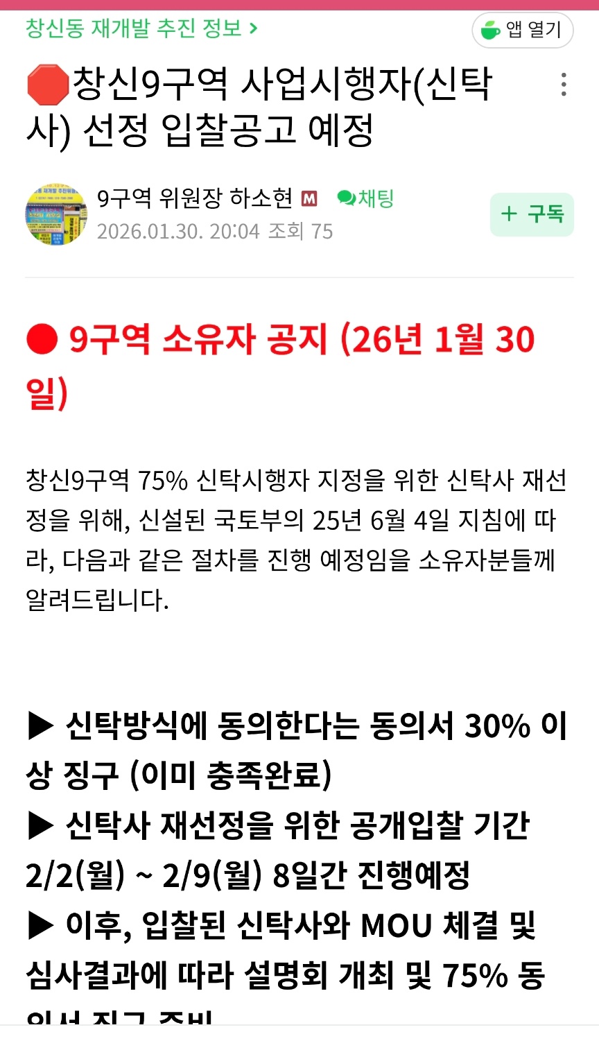 안녕하십니까? 9구역 소유자분들께 공지드립니다. 2/9일 입찰을 마감한 결과 대신자산신탁이 창신9 구역 사업시행자 선정 입찰에 응하였음을 알려드 립니다. (수수료 1.0%, 창신10구역과 동일) 이어서 2월 12일 대신자산신탁과 MOU 체결을 맺 게 되었습니다. 현재 내부 심의가 진행중이며 아래 예상 일정에 따 라 최종 결정이 될 예정이니 참고되시길 바랍니다. 그 후 신탁 시행자 지정을 위한 추정분담금과 시행 규정 및 계약서 검토, 동의서 안내 책자 제작 등과 관련하여 종로구청과 협의를 거칠 예정입니다. ● 예상 추진 절차 및 일정 (예정) ▶ 대신자산신탁과 MOU 체결: 2026년 2월 12일 ▶ 내부심사완료 : 2026년 3월 5일 경 ▶ 사업설명회 : 2026년 3월 14일(토) 경 ▶ 개별 추정분담금 및 안내책자 발송 : ~ 2026년 3월 19일 경 ▶ 동의서 징구 개시 : 2026년 3월 20일 경부터 * 상기 일정은 진행 상황에 따라 변경될 수 있으며, 변경시 재 공지드리겠습니다.