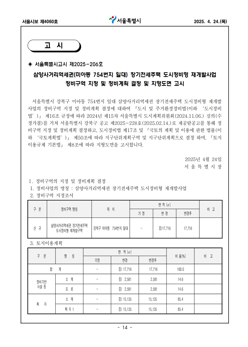 3주 전삼양사거리역세권(미아동 754번지 일대) 장기전세주택 도시정비형 재개발사업 정비계획 결정