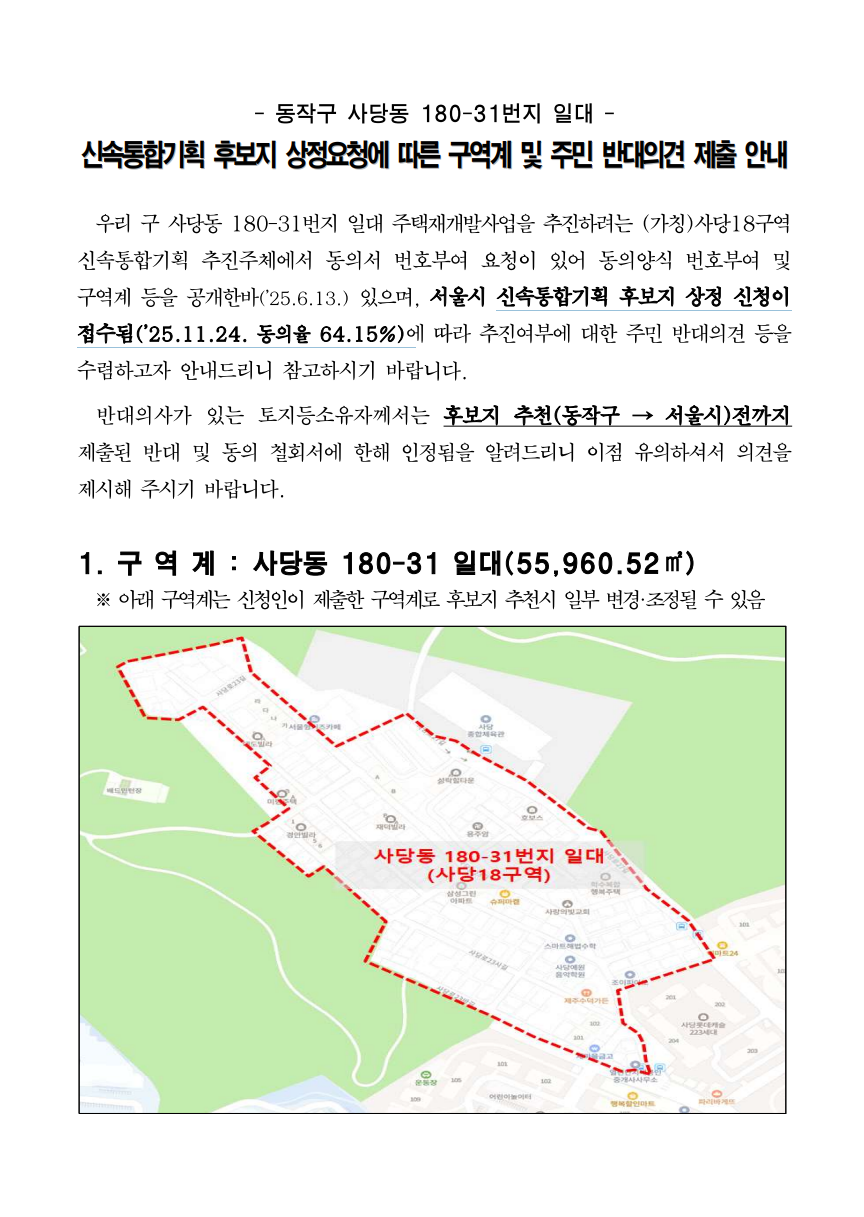 (가)사당18구역 추가되었습니다. 신통기획 후보지 상정신청 (’25.11.24. 동의율 64.15%)